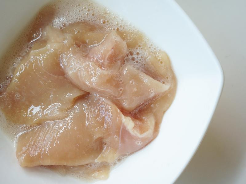 2.雞胸肉片成約1.5公分厚度的片狀,將醃漬料通通倒入并充分抓拌均勻后靜置15分鐘。
